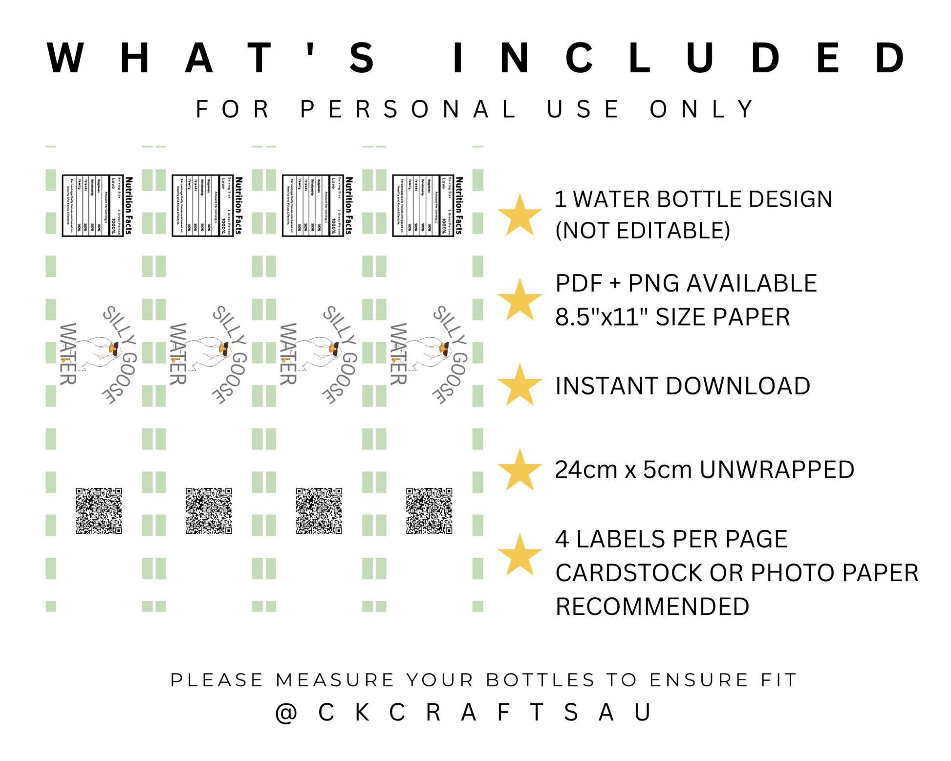 - PDF file paper size 8.5x11in (Letter). Designed to fit standard water bottles.